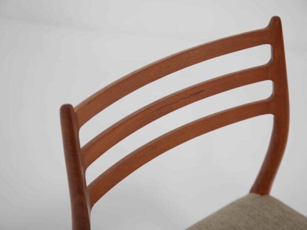 Niels Moller 78 teak dining chairs are in our opinion among the very best dining chairs from this period. If Danish modern is your style then the Moller 78 chairs have likely been on your radar. I have personally had a set of Niels Moller chairs around my own dining table for many years and I can attest to their strength and comfort. I like long lingering hours at the table and these chairs aid that.There are two types of teak Moller 78 – the ones where the leg cuts off at the seat and the ones where the leg goes up into a hump that rises above the seat. This set is the latter which in our experience over the years are the more popular version.