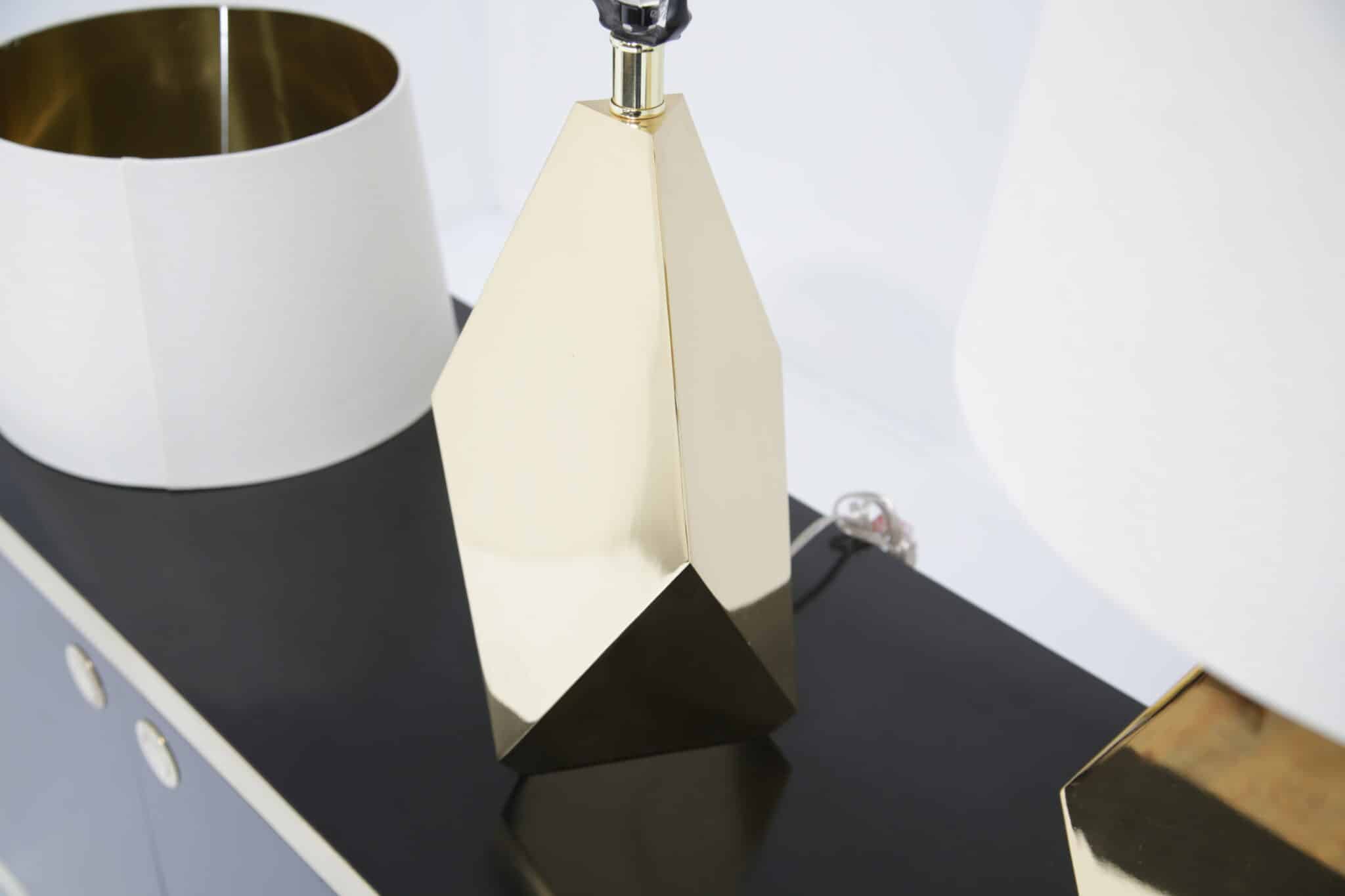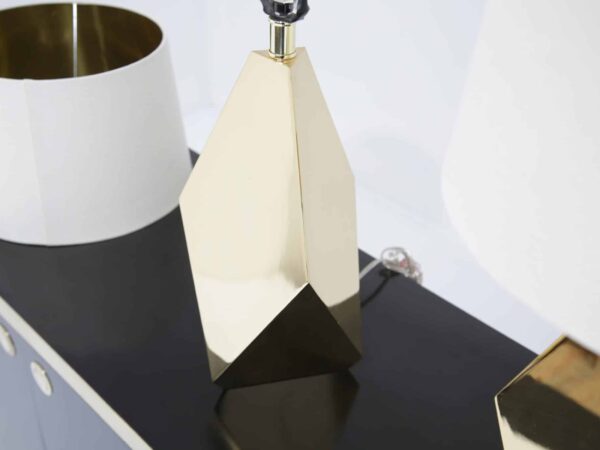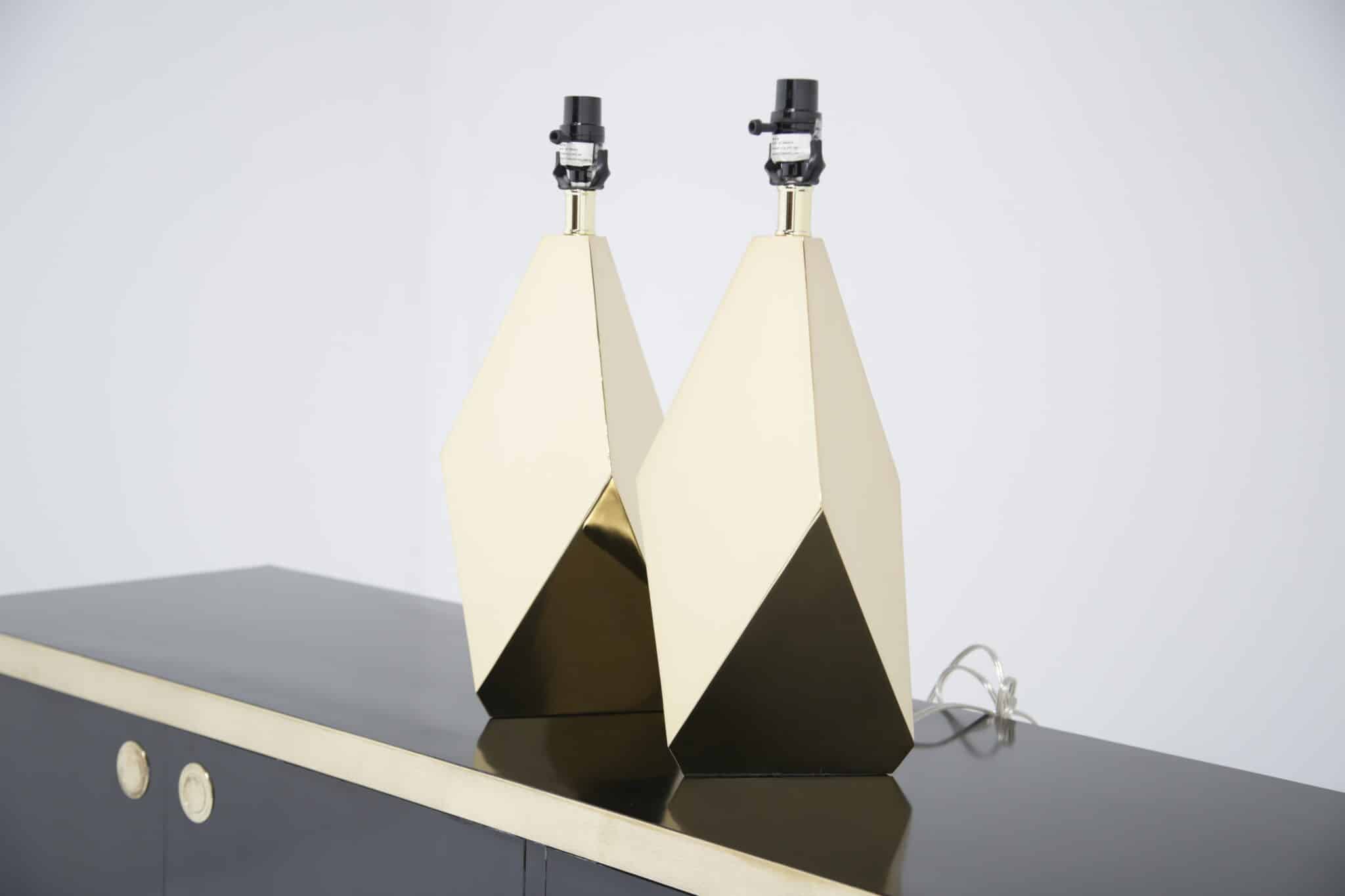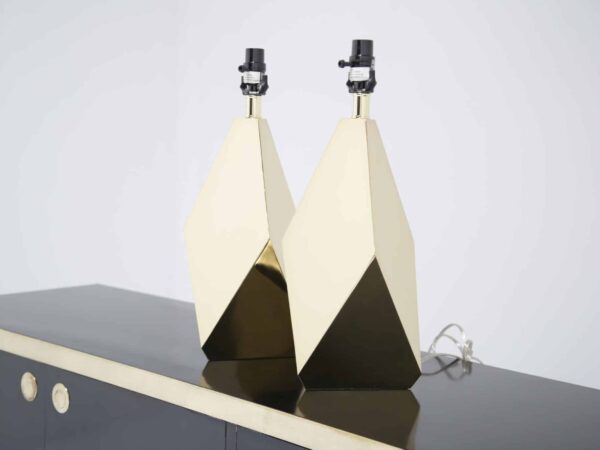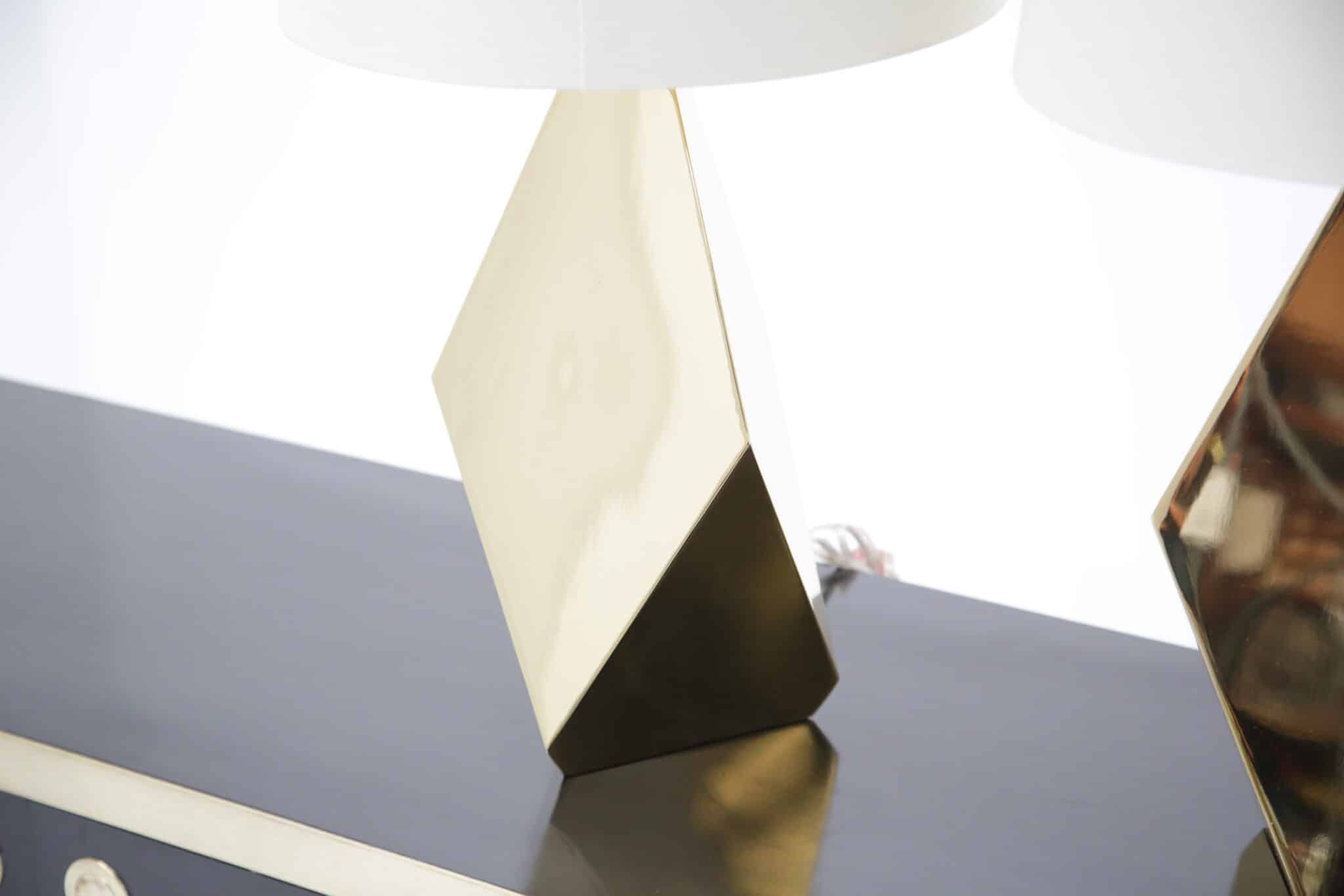 A striking pair of faceted brass table lamps with clean mid-century lines. Modern-made with timeless appeal, ready to elevate any space.