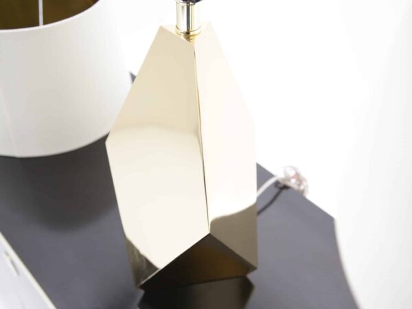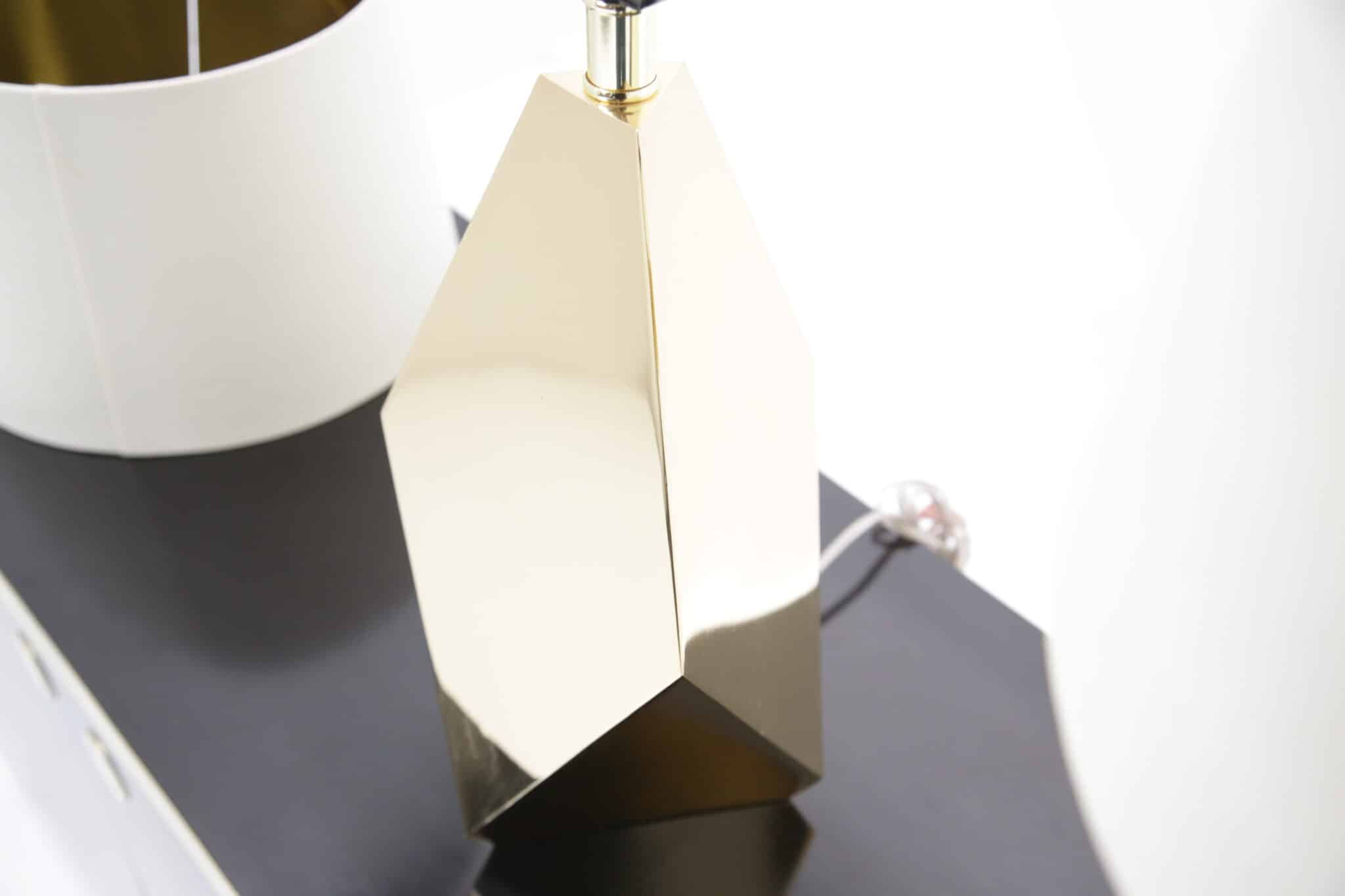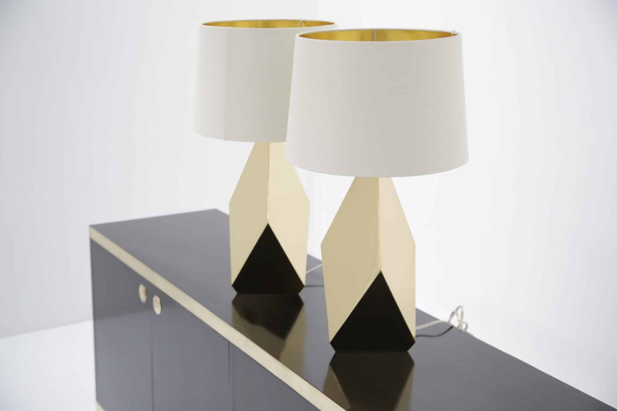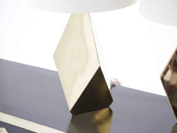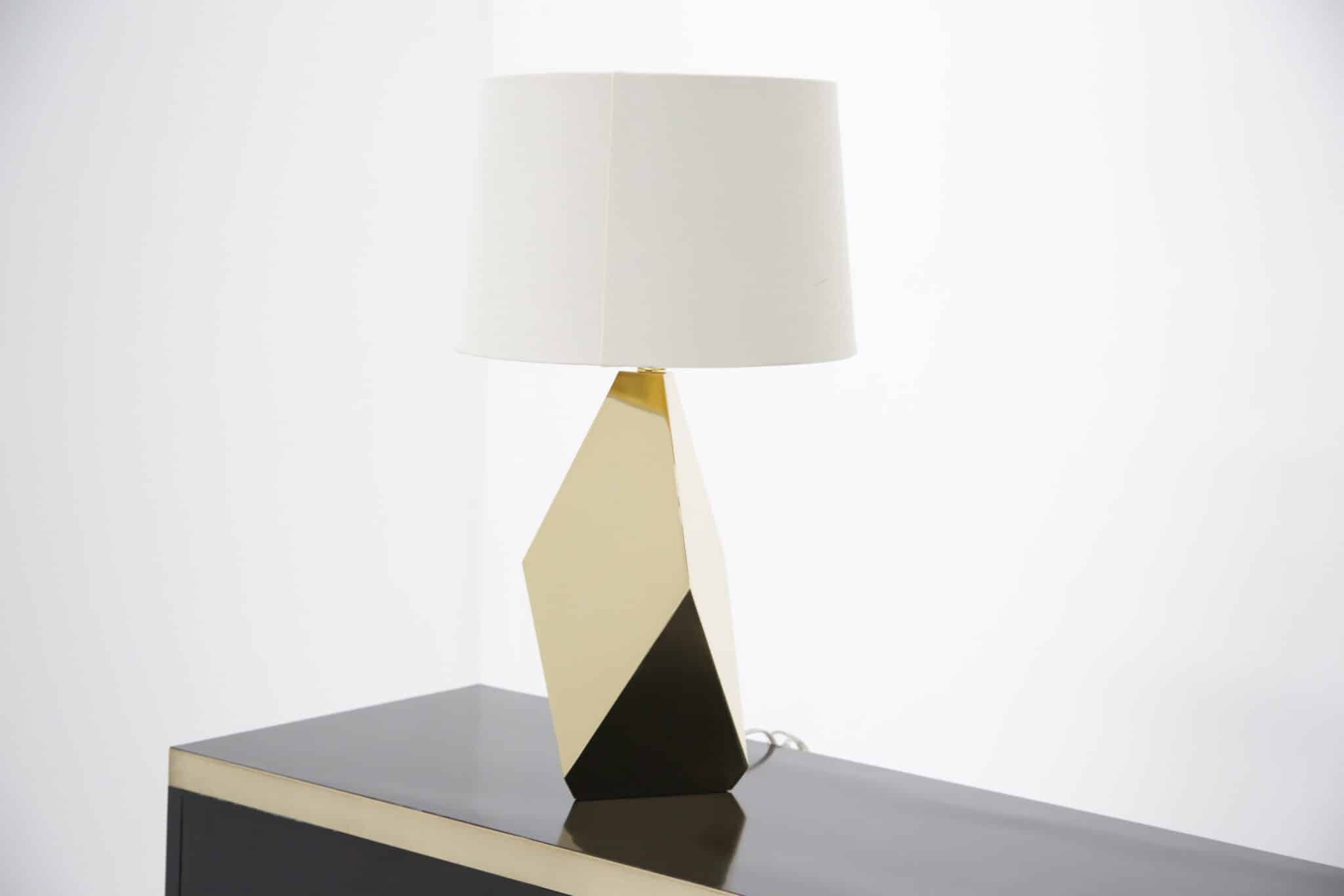 A striking pair of faceted brass table lamps with clean mid-century lines. Modern-made with timeless appeal, ready to elevate any space.