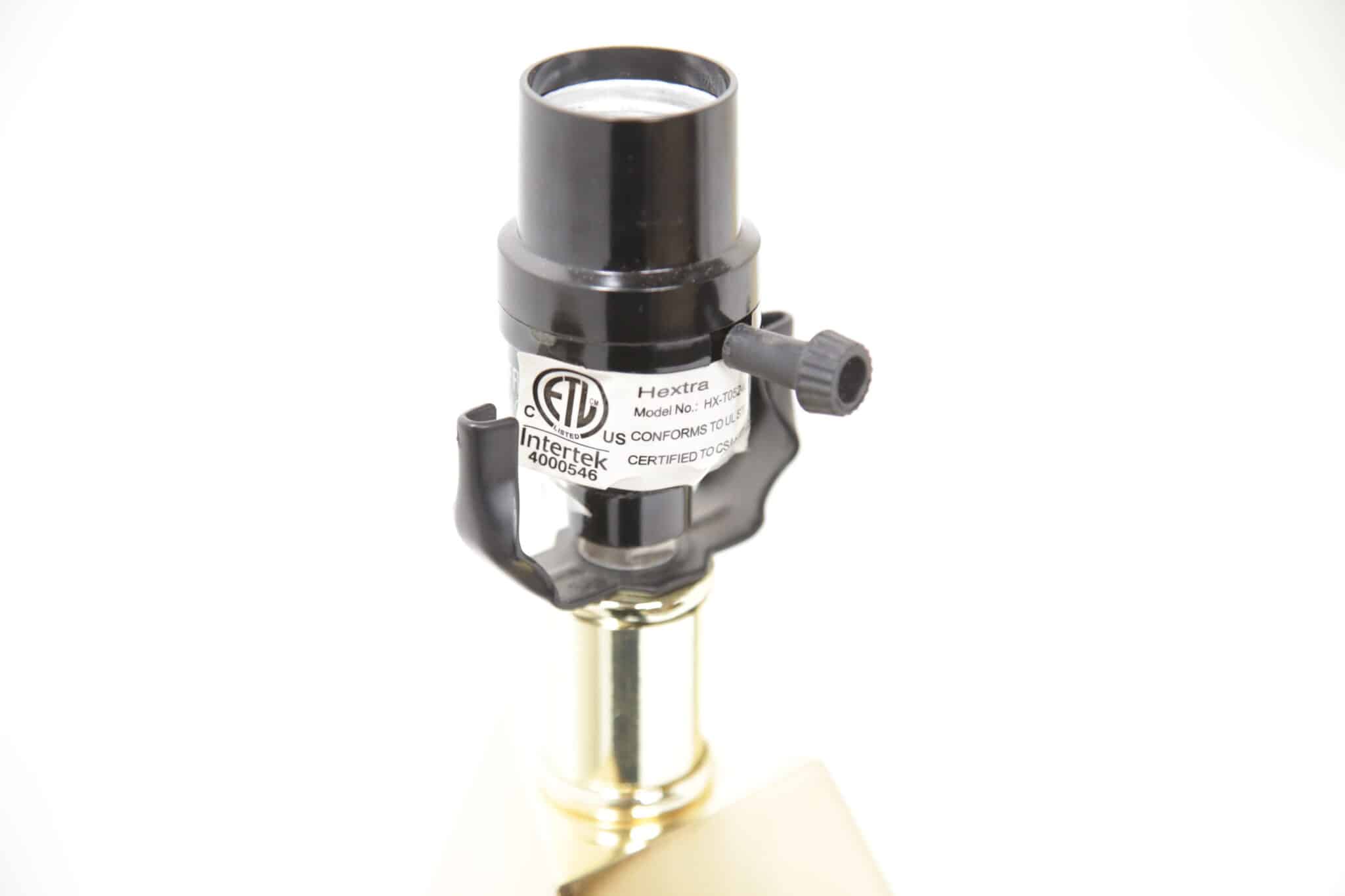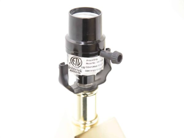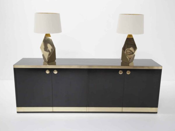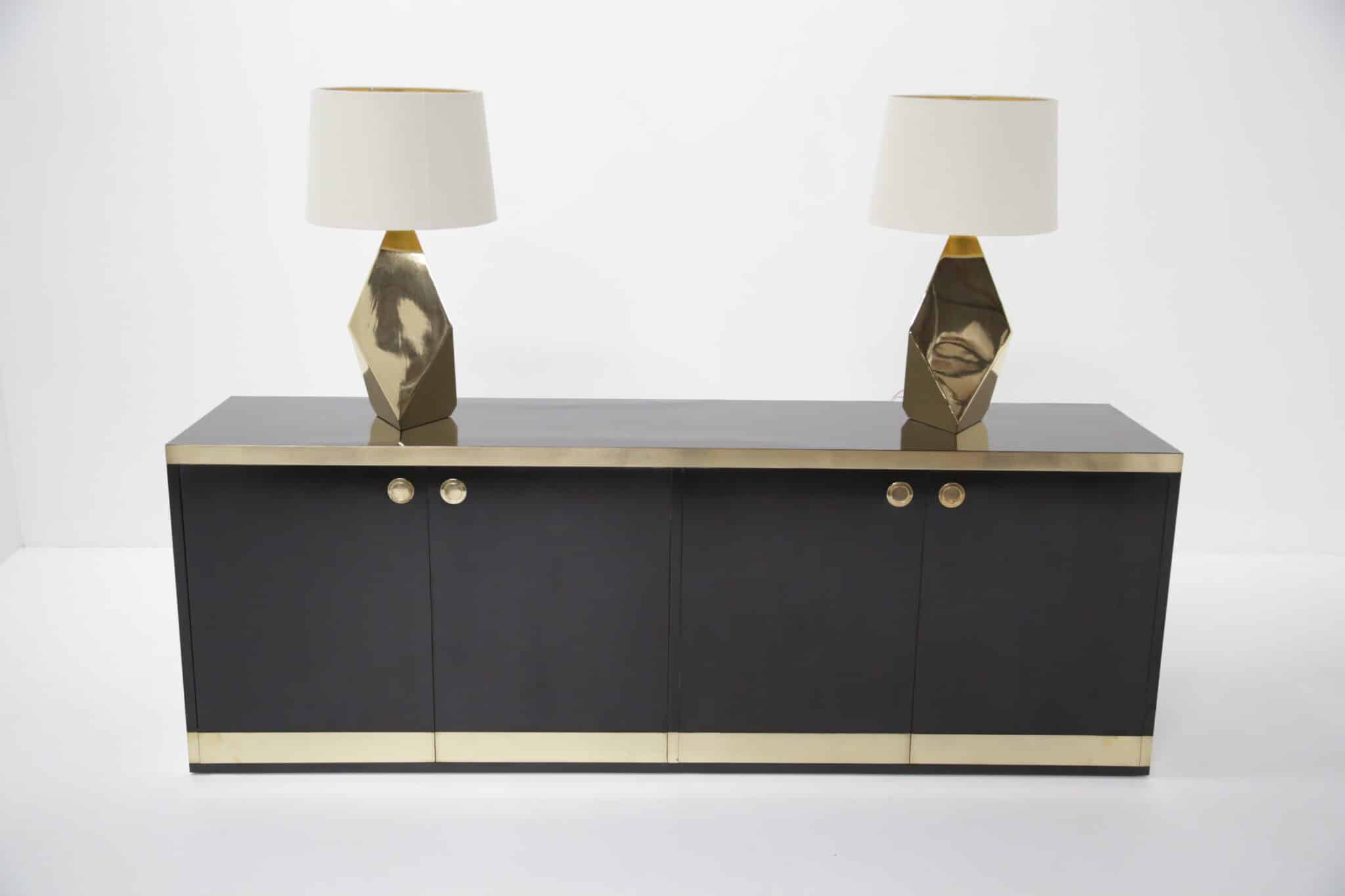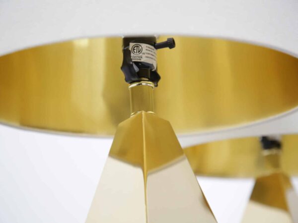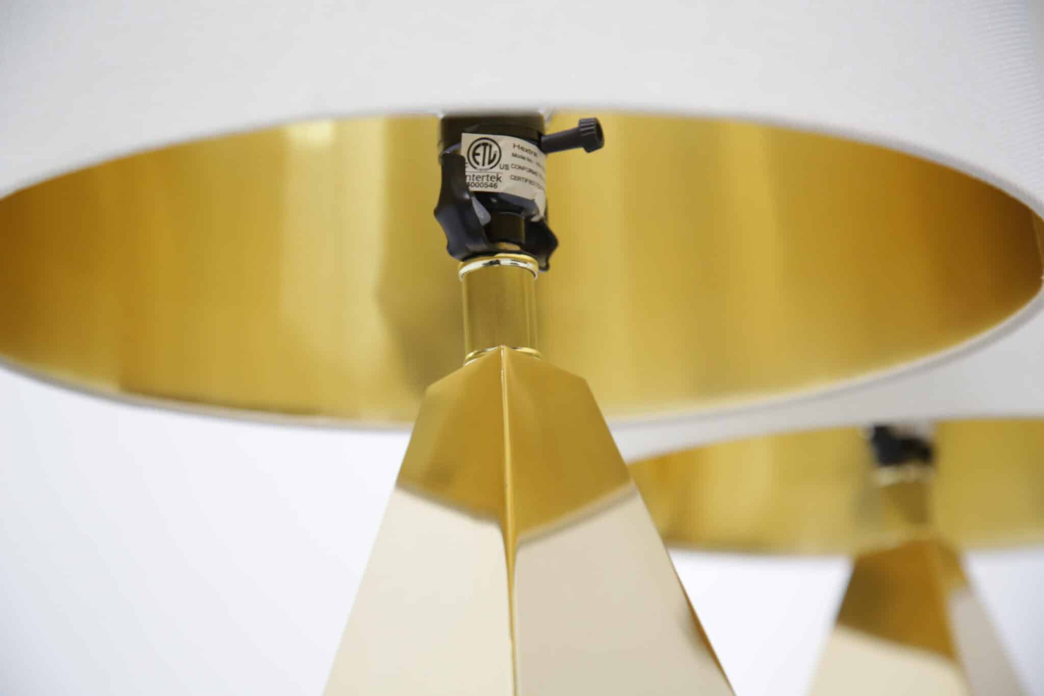 A striking pair of faceted brass table lamps with clean mid-century lines. Modern-made with timeless appeal, ready to elevate any space.