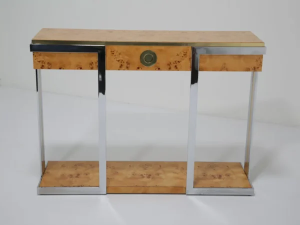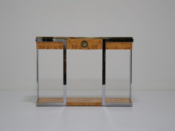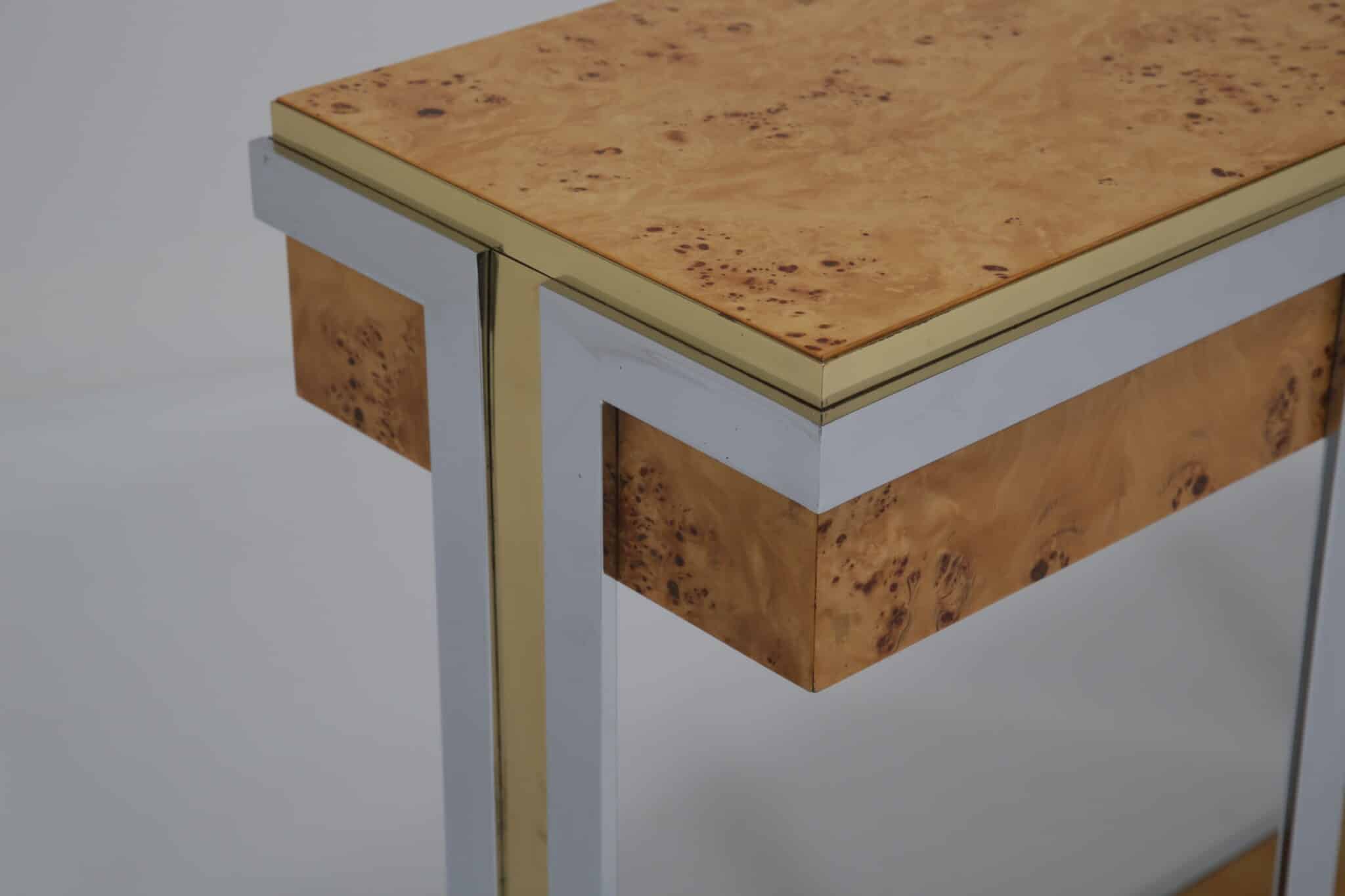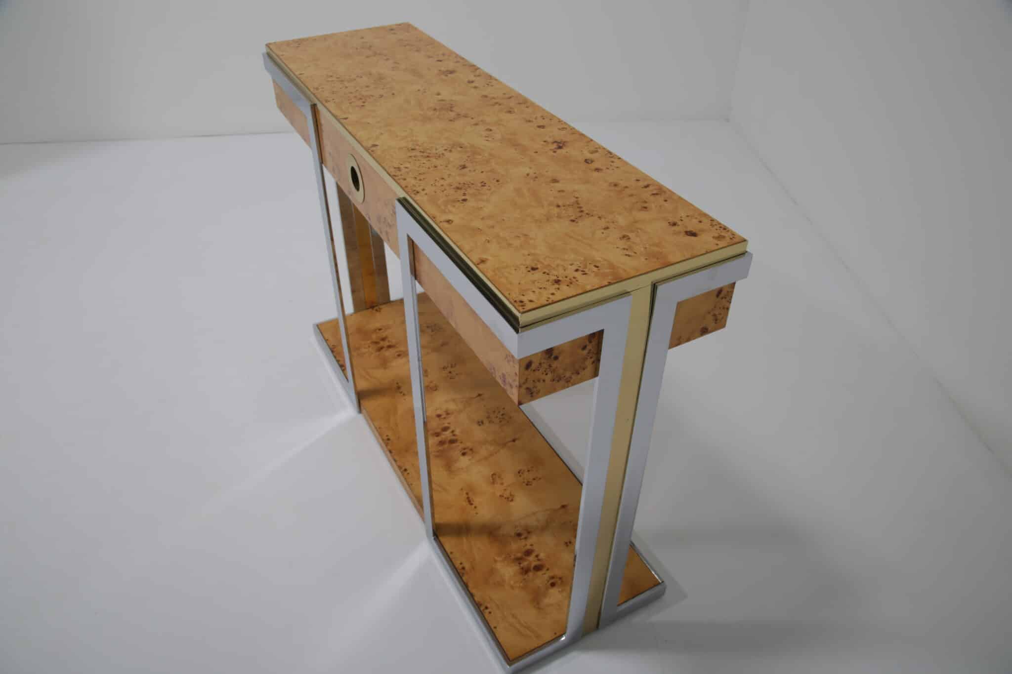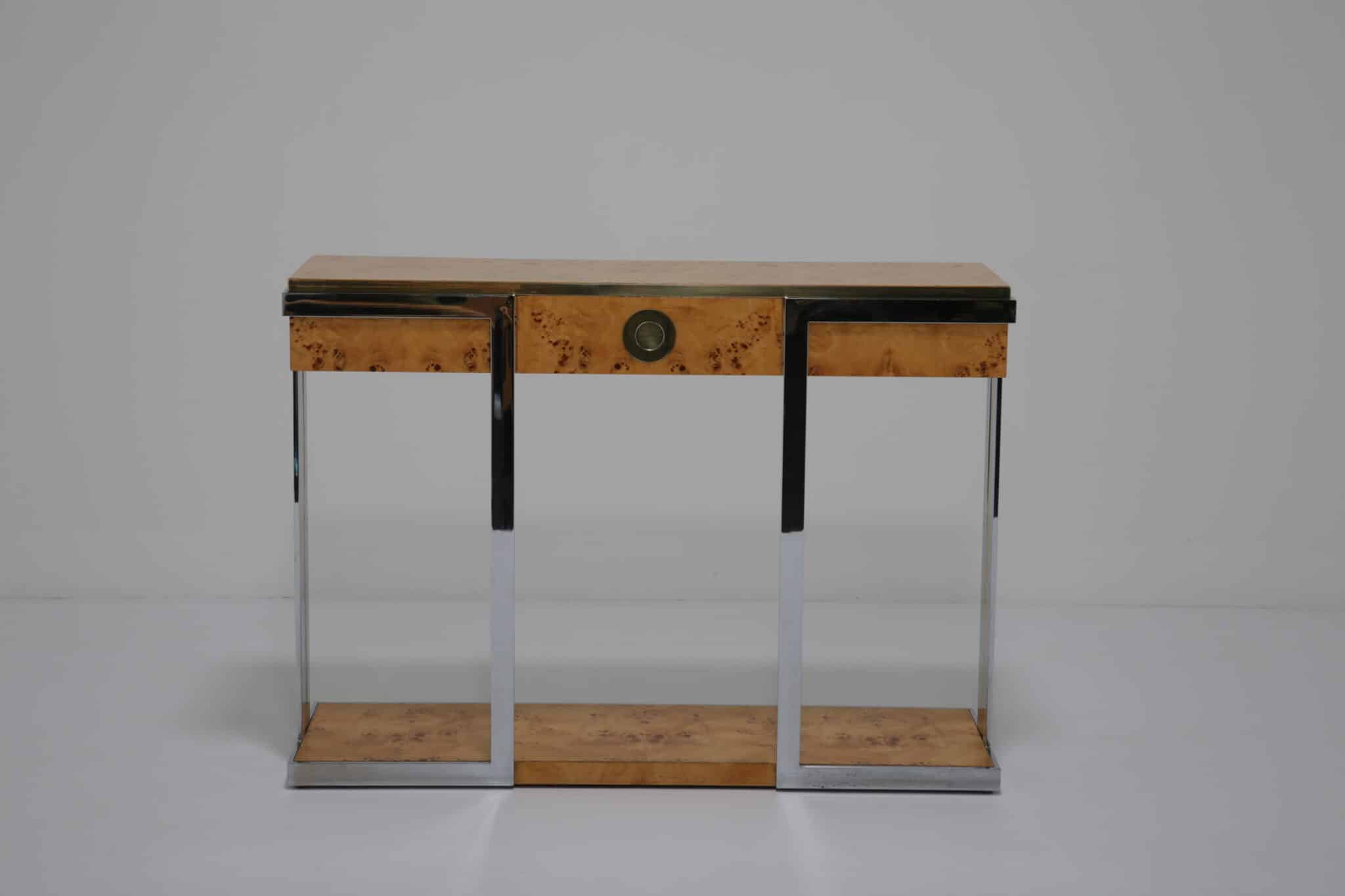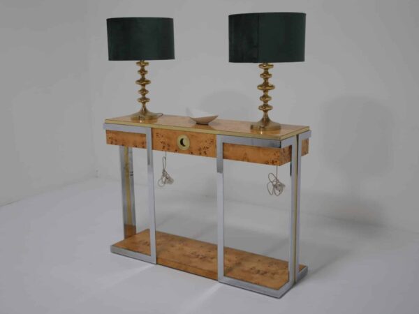 The table itself features a walnut burl top, flat bar chrome and a brass drawer handle. It’s a mix of materials we love and something that really pops while giving that wonderful mid-century feel to your home. This piece will also work very well in other spaces and Ive also seen them used like an open bar with bottles and glasses on them. Very little restoration has been done, a good clean and a tiny spec of veneer glued down. All in all this Mario Sabot console table is in lovely presentable usable condition.