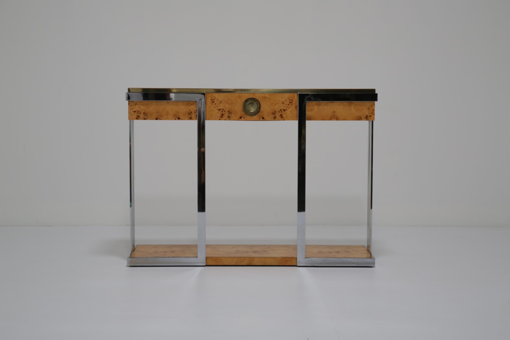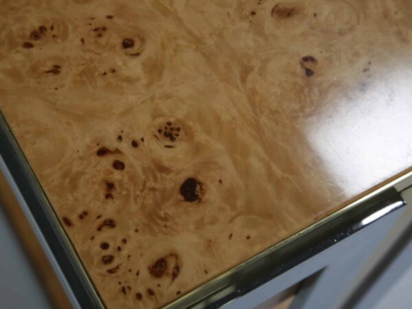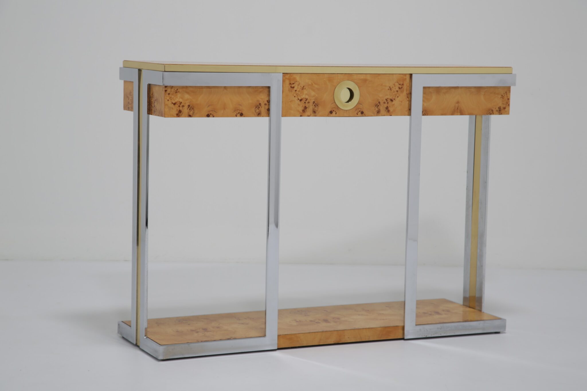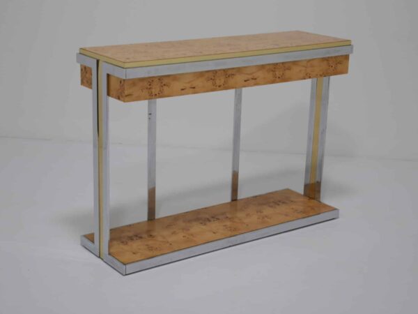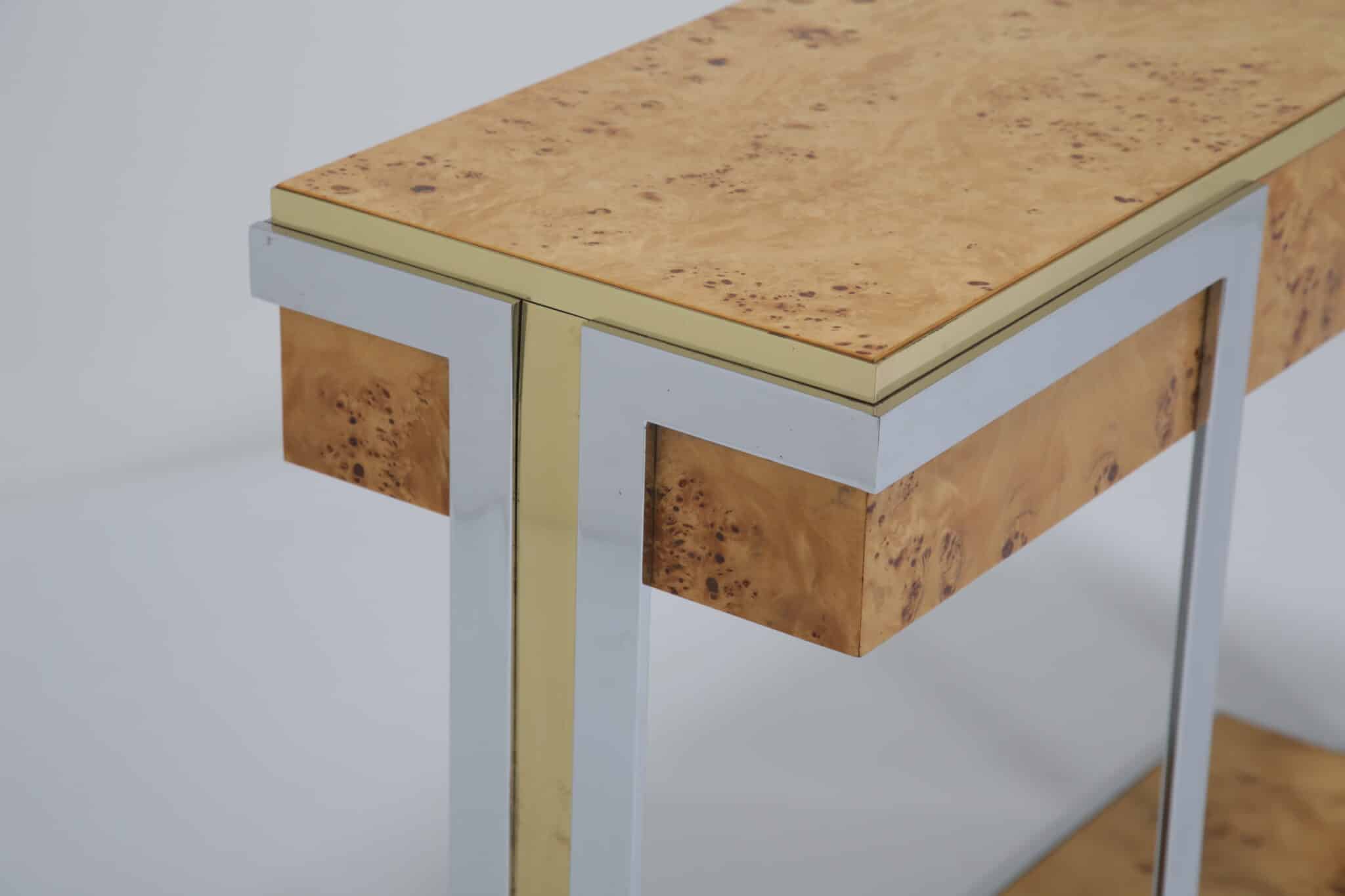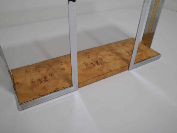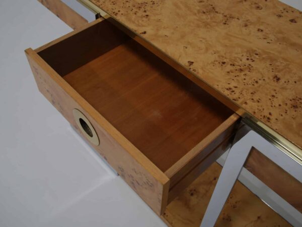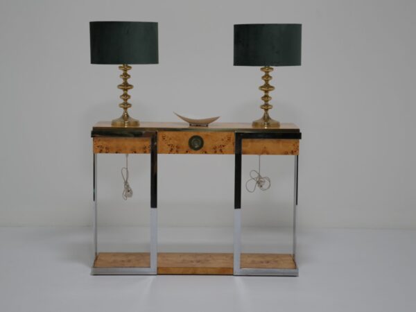 The table itself features a walnut burl top, flat bar chrome and a brass drawer handle. It’s a mix of materials we love and something that really pops while giving that wonderful mid-century feel to your home. This piece will also work very well in other spaces and Ive also seen them used like an open bar with bottles and glasses on them. Very little restoration has been done, a good clean and a tiny spec of veneer glued down. All in all this Mario Sabot console table is in lovely presentable usable condition.