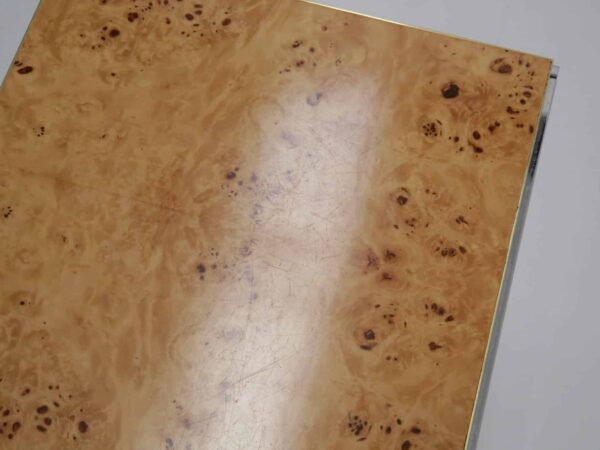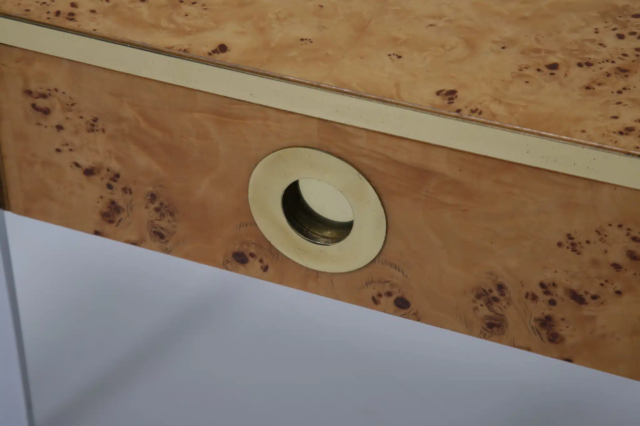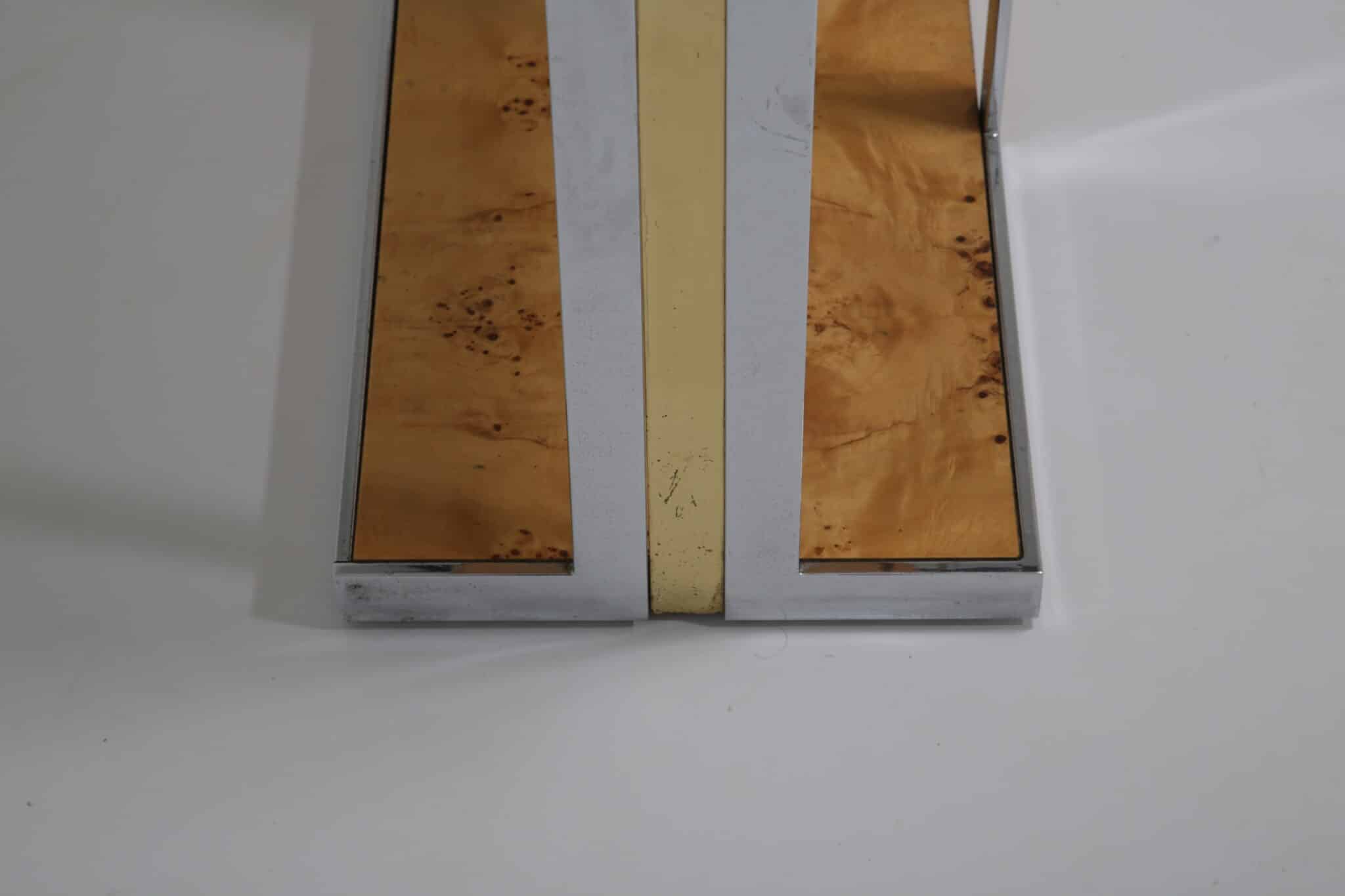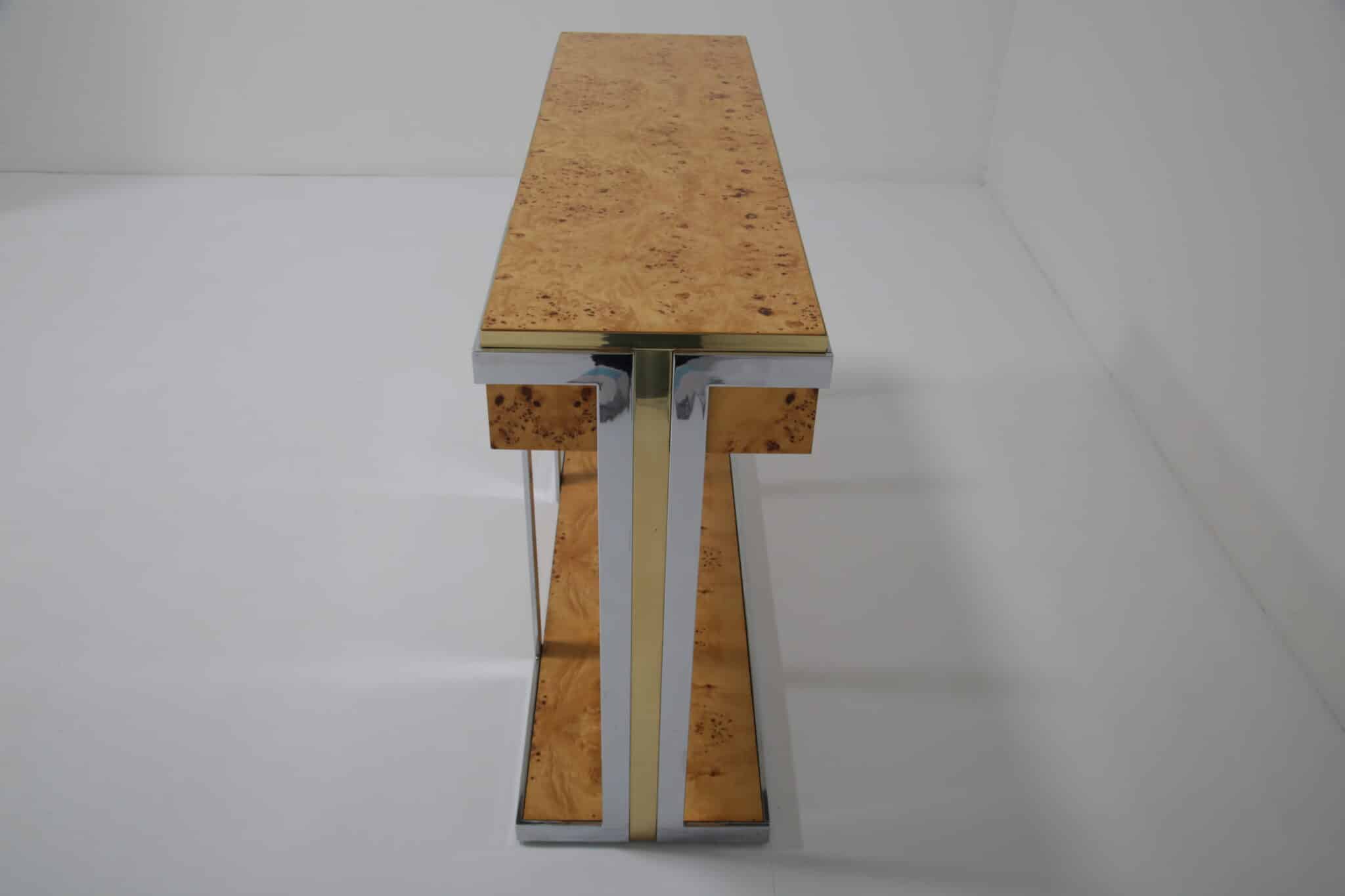 The table itself features a walnut burl top, flat bar chrome and a brass drawer handle. It’s a mix of materials we love and something that really pops while giving that wonderful mid-century feel to your home. This piece will also work very well in other spaces and Ive also seen them used like an open bar with bottles and glasses on them. Very little restoration has been done, a good clean and a tiny spec of veneer glued down. All in all this Mario Sabot console table is in lovely presentable usable condition.
