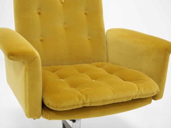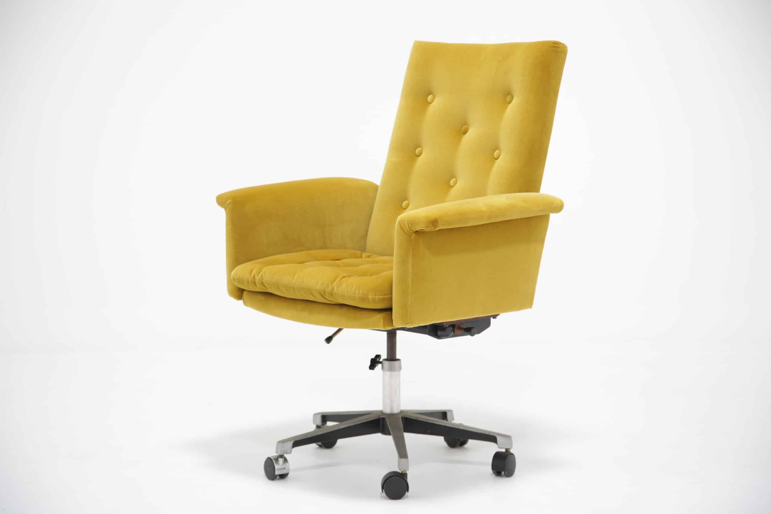 Moreover, the chair has been fully refurbished to bring out its timeless appeal. It now features modern mustard cotton velvet upholstery, which not only adds a pop of vibrant color but also enhances the overall sophistication of your office decor. In addition, its swivel and tilt functionality ensure superior comfort and flexibility, making it ideal for extended work hours or casual relaxation.
