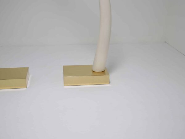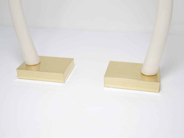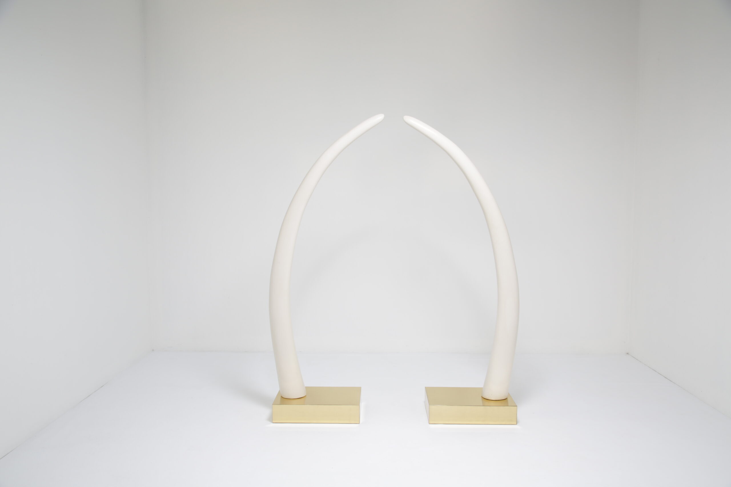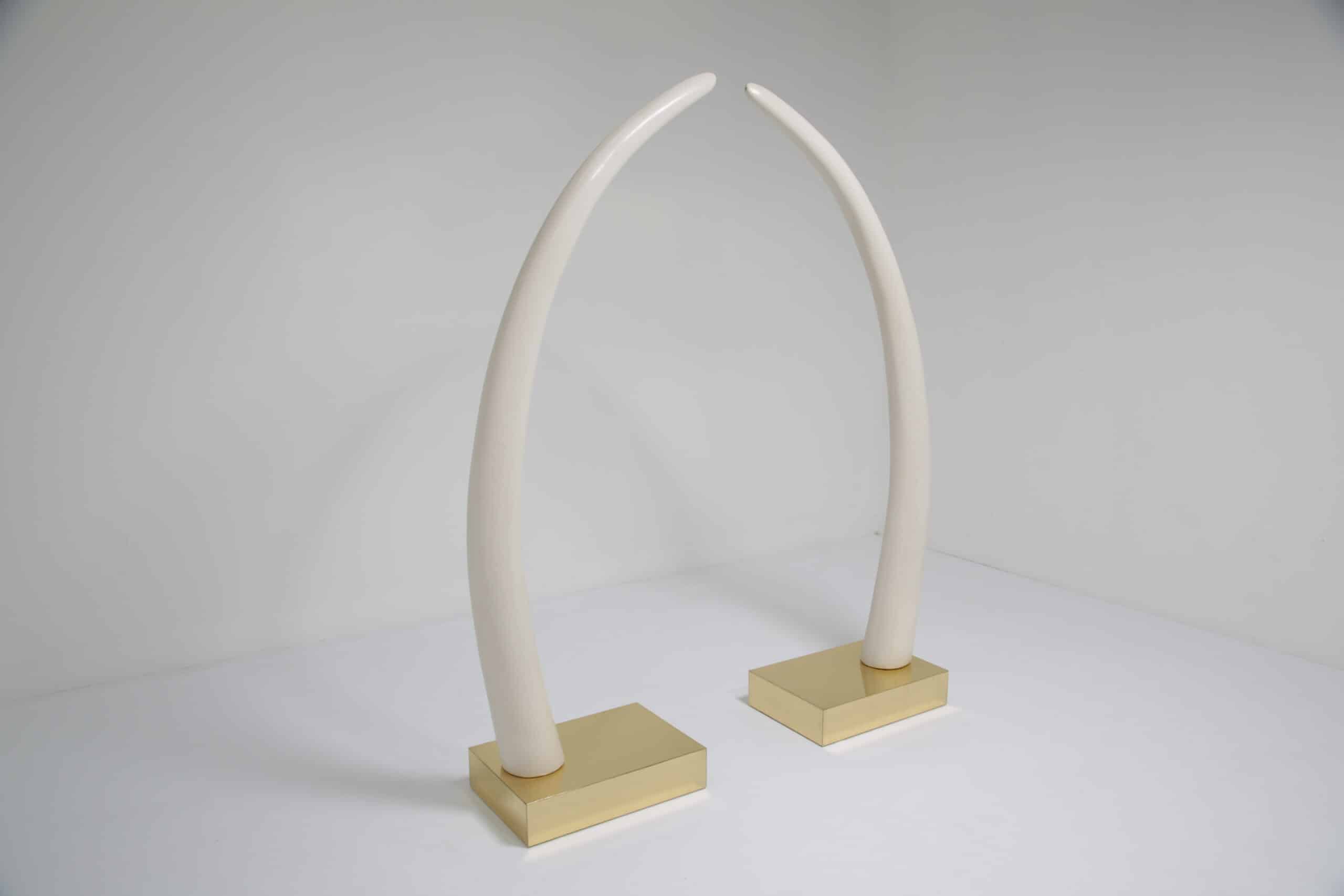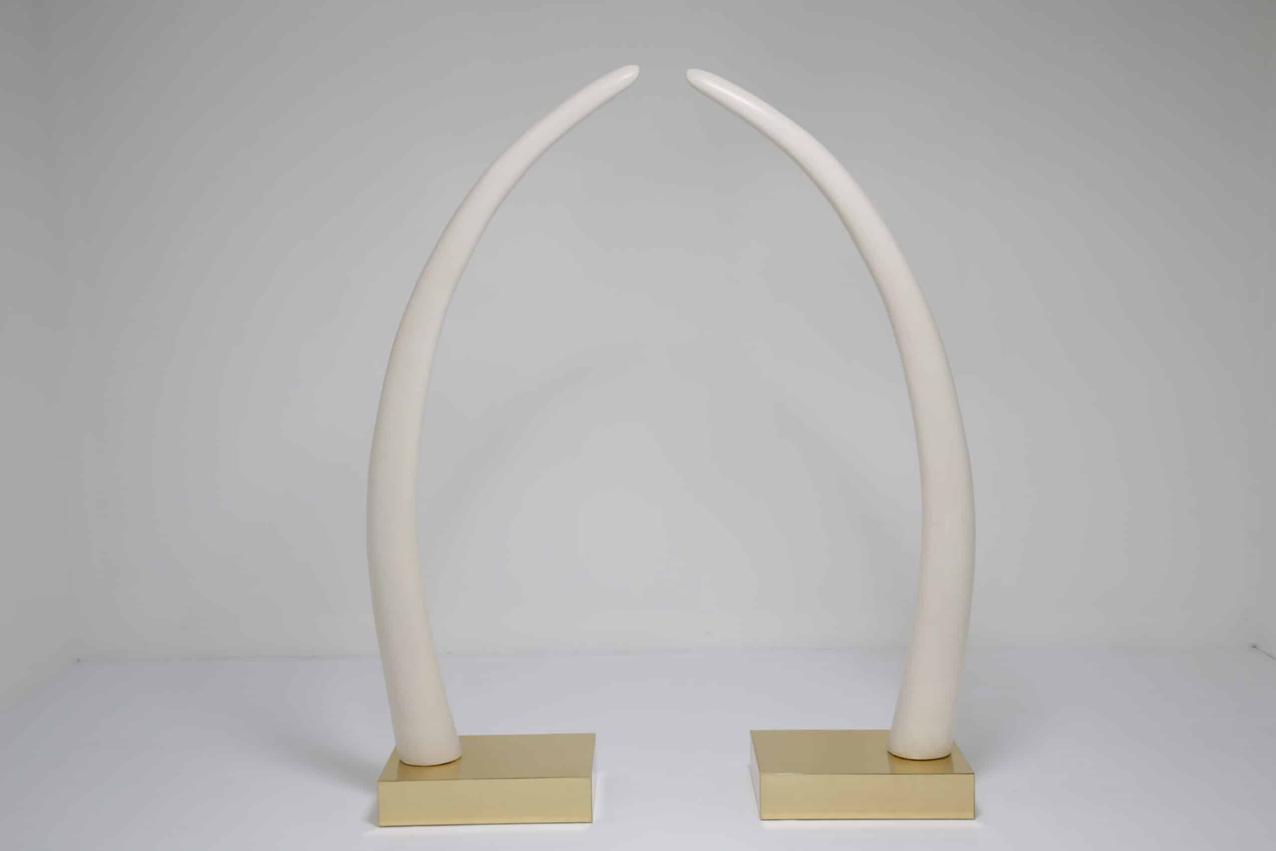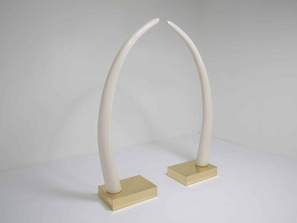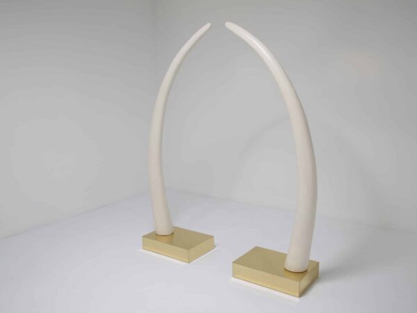 Perfect for collectors or those who appreciate iconic design pieces, these Decorative Faux Elephant Tusks on a Brass Base offer a timeless and sophisticated focal point for any room.