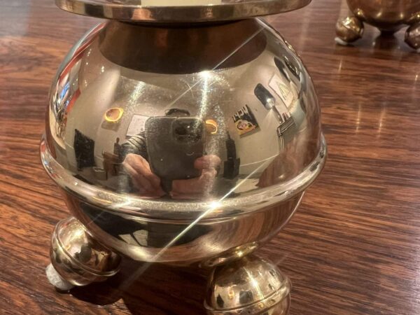 Add a touch of Scandinavian modernism to your home with these round Gusum brass modernist candlesticks. Crafted with a unique ball-shaped design, they feature sleek bun feet that enhance their contemporary aesthetic.