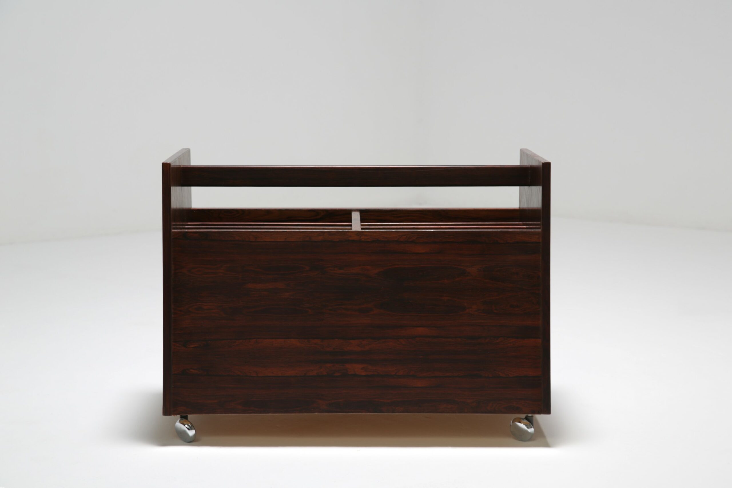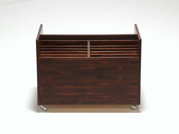 Vintage Rosewood Magazine Holder – Those who love reading will know the joy of sitting at your favorite chair or sofa and open up an exciting book or browsing trough a magazine and this piece of furniture might just be the “extra” item you are looking for. It is made out of rosewood, which has a lovely dark protruding grain with a handle to carry as well as castors to allow you to move it around with ease. It was designed by the Norwegian designer Rolf Hesland for Bruksbo and sold during the 1960s under the model name “Scala”.